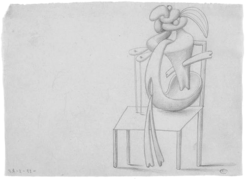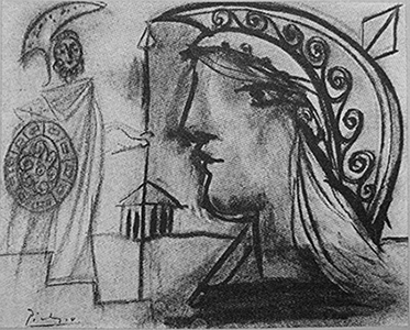 On the 28 February, approximately halfway through producing the Une Anatomie series, Picasso also created a drawing that while retaining some of the skeletal features, also expressed a healthy exuberance for life. It was titled Seated Woman and I became equally fascinated by its articulate sculptural quality and transcribed it into three-dimensions (Figs. 33-34). Despite its date and stylistic similarities with the anatomy drawings it was not reproduced in Minotaure, and yet, it may well be another clue to fully understanding the raison d'être behind the series. One has only to compare it with the 1932 Boisgeloup plaster portraits of Marie-Thérèse to see that the seated figure is a portaite of her (Fig. 35). The joie de vivre expressed by the seated woman conceals a mixture of wishful thinking and actual observation on Picasso’s part. In Seated Woman Marie-Thérèse appears healed and fulsome to the point of appearing to literally give birth, which is suggested by the liquid-like form that gushes forth from a vagina-like shape. Typical of Picasso’s love of polysemy the flowing shape could equally depict legs. Was this Picasso’s way of encouraging her return to health? Unlike the pin or button-headed figures in the Une Anatomie series, which Gasman argues Picasso often used as a disparaging motif, this seated figure is clearly characterised by Marie-Thérèse’s facial features and additionally by her distinctive crescent shaped hair, which Picasso associated with the “crescent moon” and Minerva’s crescent helmet. In his 1934 charcoal drawing Minerva, Picasso lovingly pays homage to his muse by associating her with Minerva the goddess of wisdom, creativity and the arts and even uses the water motif on her helmet’s crescent finial to remind us of his muse’s love of water (Fig. 36).