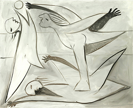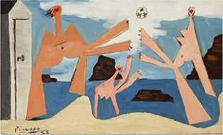 Bathers Playing with a Beach Ball, 1928, is typical of the joyous beach scenes that Picasso produced during this period whilst also, according to Gasman, displaying his subliminal presence in the form of the lockable beach hut on the left of the painting. The bathers in the 1928 Dinard paintings have an anonymity that no longer exists in his similarly themed drawing Bathers with a Beach Ball produced in 1932, in which Marie-Thérèse’s face is replicated on all the cavorting figures (Fig.7).
