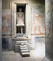 1. Fausse porte égyptienne avec marches menant à une table d'offrandes. Mastaba de Ti, Sakkara Égypte (Cinquième dynastie vers 2494 – 2345 avant JC).
