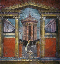 La série Piazza d’Italia, évoquée plus haut, dans toutes ses nombreuses manifestations, détient en grande partie la clé du principe paternel qui guide la majorité des thèmes de De Chirico. Afin d’appréhender son récit iconique et ses énigmatiques qualités oniriques pré-surréalistes, il convient que nous nous référions à un autre prototype beaucoup plus ancien : le second style tragique de la peinture pompéienne (80 av. J.-C.) qui se serait lui-même inspiré des anciennes iconographies des tombeaux étrusques voire égyptiens (Fig. 1-4). Toutes ces illustrations représentent véritablement un acte d’apothéose atavique que parachève l’œuvre moderne de De Chirico puisqu’elle se compose de nombreuses interfaces picturales entre le fils et le défunt père. Du point de vue de la composition, il utilise le lien énigmatique entre métaphysique et perspective pour réaliser cette réunion ancestrale, à l'instar des artistes pompéiens de 80 avant JC qui ont créé le style tragique. Il réinvoque même une grande partie de leurs images telles que le tholos, comme symbole de la mémorialisation, de la dissolution et du devenir, le « mur » comme barrière symbolique entre les mondes physique et métaphysique, le péristyle pour indiquer l'espace profond et le placement des objets, des ex voto pour attirer et apaiser les divinités évoquées dans ses tableaux.