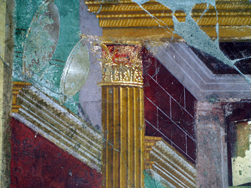 Les nombreux motifs funéraires et votifs qui apparaissent dans les anciennes peintures murales romaines du style tragique ainsi que dans les œuvres de De Chirico au xxe siècle évoquent la présence d’un autre monde. Dans les deux cas, cette sensation est renforcée psychologiquement par l’utilisation de systèmes de perspective. Même s’ils sont considérés à travers les standards post-Renaissance, ils attestent tous deux d’une compréhension extrêmement sophistiquée, si ce n’est des lois de la perspective, tout au moins de la psychologie visuelle les entourant. Des peintures comme celles trouvées dans la Villa di Poppea (Oplontis) et la Maison de Fabio Rufo impliquent le spectateur sur un niveau phénoménologique hautement efficace malgré le fait qu’elles ne soient pas conformes aux règles mathématiques et géométriques développées à la Renaissance (fig. 1–2). En effet, si les peintres antiques et De Chirico avaient adhéré à ces règles, leurs peintures n’auraient pas atteint le méta-texte psychologique que nous leur associons. En d’autres termes, le contenu latent a déterminé l’organisation de la forme elle-même. Tandis que les peintures de De Chirico reposaient sur le mariage de la métaphysique et de la poésie, les anciennes peintures murales étaient caractérisées par les réalités virtuelles du trompe-l’œil en quête de mondes métaphysiques. Afin de produire une image picturale du monde visible, il faut bien entendu appliquer les règles précises de la perspective. Si en revanche on essaie de créer un monde métaphysique onirique, la précision optique des règles de la perspective gêne cet objectif. De ces peintures anciennes et contemporaines, il est important de retenir qu’à travers l’illusion dramatique et la métaphore, un état transitoire de conscience est créé entre le physique et le métaphysique.