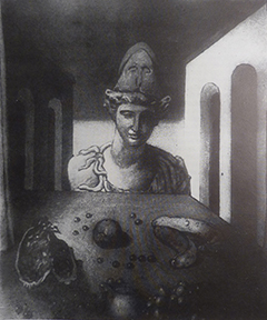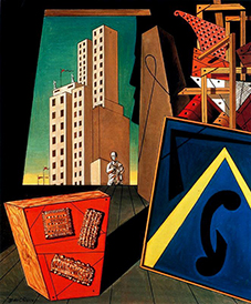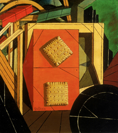 Nature morte évangélique (1916) est l’un des nombreux exemples de ses séries Intérieurs où il utilise des cartes au lieu d’insérer des peintures pour suggérer la présence d’un monde au-delà de la pièce (fig. 1). Or, qu’en est-il des motifs de nourriture sur la carte ? Le titre lui-même indique certainement un acte votif. Une version produite un an plus tard sous le même titre représente une statue, une référence plausible à une déité, regardant les biscuits en offrande (fig. 2). La Mort d’un esprit et Salutations d'un ami lointain renforcent cette théorie (fig. 3–4). Cette forme de peinture votive relie à nouveau l’œuvre de De Chirico aux anciennes peintures murales dans lesquelles les motifs votifs culinaires sont également placés devant des entrées comme celles évoquées précédemment au sujet de la Maison de Marcus Lucretius Fronto.