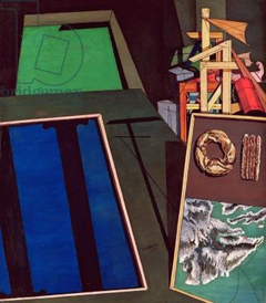 Toutes ses séries d’intérieurs soutiennent cette notion que l’intérieur est un signe « indexical » révélant un espace ou une présence au-delà. La peinture agit ici comme signe « indexical » et symbole – signifiant et signifié. Dans son tableau Nature morte métaphysique peint en 1973, soit cinq ans avant sa mort, De Chirico invoque à nouveau un thème exploré pour la première fois en 1916 qui révèle encore plus l’implicite de ses séries Intérieurs (fig. 5). On peut clairement voir l’esprit de l’ancêtre héroïsé, l’eidolon, qui a habité pendant près de soixante-dix ans les perspectives métaphysiques de l’espace profond de De Chirico. La présence jusqu’ici cachée apparaît enfin pour prendre les offrandes placées dans le foyer familial. Si nous considérons cette peinture ainsi que ses nombreuses versions de Temple dans la chambre, il apparaît alors une extraordinaire similarité entre son travail et le style tragique. Ces peintures font de la pièce un téménos, une enceinte murée semblable à celle du jardin sacré d’Apollon représenté dans la Villa Poppea (fig. 6) ou à celle de la peinture murale d’une tholos dans la Maison du Labyrinthe.