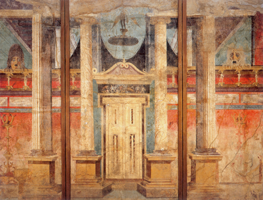 La relation entre la perspective linéaire et atmosphérique dans de telles peintures est plus poétique que logique. Comme chez De Chirico, l’utilisation poétique de multiples points de fuite et d’ombres disloquées concourt à créer une atmosphère énigmatique qui baigne bon nombre de ses peintures. Dans la peinture du Labyrinthe, l’espace illusoire au-delà du mur est encore amplifié par l’alignement soigneux des colonnes dans la pièce elle-même. Les différents plans picturaux, tant réels qu’illusoires, se déploient d’une manière si naturelle qu’ils nous transportent, presque imperceptiblement, de la pièce au monde au-delà du mur. Or, il existe un paradoxe majeur contenu dans les anciens modèles : la perspective linéaire est utilisée pour créer un sentiment d’espace profond, ce qui incite notre psyché à entrer dans l’image plane. Cependant, quand nous essayons de le faire, nous en sommes empêchés par des murs ou des motifs de portes fermées comme ceux dépeints dans le triclinium de la Villa Publius Fannius Synistor (fig. 4). L’espace au-delà du mur est inaccessible – il est sacro-saint, comme le prouvent l’entrée murée dans la peinture du Labyrinthe et les masques démoniaques de chaque coté de la porte dans la peinture de Synistor. En effet, toutes deux renforcent l’idée du caractère de sainteté inaccessible de l’espace au-delà de la porte.