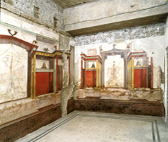 Dans le style tragique ancien, la signification du motif récurrent du mur repose sur le fait qu‘il semble créer une barrière physique renforcée psychologiquement parce qu’il est positionné sur le même plan que le mur réel sur lequel il a été peint. Ainsi, le mur réel disparaît et l’illusion devient la réalité. Invariablement, le sommet du mur peint s’arrête avant celui du mur réel. Dans cet espace vide, les formes architecturales comme le péristyle et la tholos créent une illusion spatiale au-delà du mur peint et par conséquent du mur réel. De plus, la perspective atmosphérique renforce le sens d’un espace au-delà du mur peint et du mur réel. On trouve un exemple de cette vision sophistiquée de la fusion des mondes réel et virtuel avec la représentation de la tholos dans la peinture murale dans l’oecus corinthien de la Maison du Labyrinthe ainsi que dans la peinture du cubiculum M de Boscoreale, toutes deux citées précédemment.