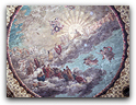 With reference to fig. 2, it is unlikely that drop-curtains featured in the Roman stage. The material evidence suggests that painted backdrops and not curtains rose up from a slot that ran the length of the wooden stage floor. The curtain in this painting may well be a stylised grotto or underworld reference inviting us to enter a fantasy world dedicated to Apollo. This is suggested by the broken pediment beyond which we are shown Apollonian symbols such as the Delphic omphalos within the base of the oracular tripod and the accompanying griffin, all of which are located above the demonic central mask. Fig 2 links to a similar use of this motif but in its original stone form, indicating the edge of a cave or grotto leading to a metaphysical world.