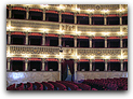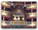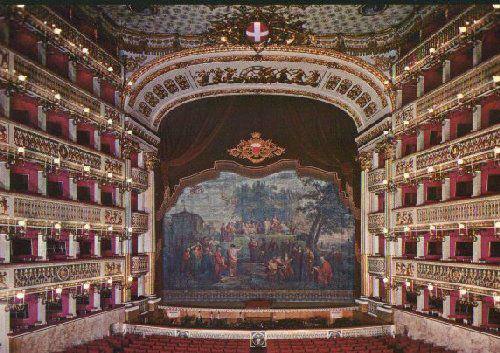 The answer to the above question is relatively simple and it lies in the decor for one of the earliest Italian proscenium theatres - Teatro di San Carlo in Naples, which opened in 1737. Following its destruction by fire in 1816 it was redesigned by Antonio Niccolini who, in addition to being an architect and scenographer, was also the director of the Accademia di Belle Arti, Naples. Whilst designing the theatre's interior and the enlarged proscenium, he was also engaged in editing a 24 volume treaties on the artefacts and wall-paintings found at Pompeii and Herculaneum. Hence, it is very likely that paintings such as the Palaestra panel, may have influenced his designs for this theatre. Fausto and Felice Niccolini continued their father's work and in 1854 published Le case ed i monumenti di Pompei disegnati e descritti (Drawings and descriptions of the houses and monuments of Pompeii). In this publication they attempted to illustrate all the excavated public and private houses and monuments in Pompeii, along with numerous examples of artefacts and wall-paintings. Fausto also worked with his father on the 1844 interior redecoration of the Teatro San Carlo, which resulted in its current red and gold appearance. If wall-paintings such as the one found in the Palaestra at Herculaneum helped to shape the early proscenium style theatres, that does not make them depictions of theatres.