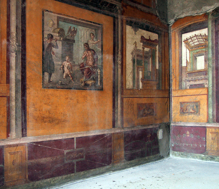 The answer to the above question is relatively simple and it lies in the decor for one of the earliest Italian proscenium theatres - Teatro di San Carlo in Naples, which opened in 1737. Following its destruction by fire in 1816 it was redesigned by Antonio Niccolini who, in addition to being an architect and scenographer, was also the director of the Accademia di Belle Arti, Naples. Whilst designing the theatre's interior and the enlarged proscenium, he was also engaged in editing a 24 volume treaties on the artefacts and wall-paintings found at Pompeii and Herculaneum. Hence, it is very likely that paintings such as the Palaestra panel, may have influenced his designs for this theatre. Fausto and Felice Niccolini continued their father's work and in 1854 published Le case ed i monumenti di Pompei disegnati e descritti (Drawings and descriptions of the houses and monuments of Pompeii). In this publication they attempted to illustrate all the excavated public and private houses and monuments in Pompeii, along with numerous examples of artefacts and wall-paintings. Fausto also worked with his father on the 1844 interior redecoration of the Teatro San Carlo, which resulted in its current red and gold appearance. If wall-paintings such as the one found in the Palaestra at Herculaneum helped to shape the early proscenium style theatres, that does not make them depictions of theatres.