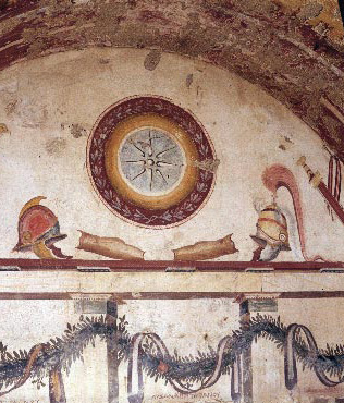 The Macedonian tomb of Lyson and Kallikles at Lefkadia (3-2BC) is much debated as a precursor of Roman 'Second Style' painting. Whilst it shares certain common features regarding architectonic pictorial space, the wall-paintings in the tomb are significantly less sophisticated in their use of pictorial perspective deployed in a 3-dimensional space. Other tombs such as that attributed to Philip II of Macedonia also contain early examples of naturalistic figuration, but no substantial pictorial acknowledgment of the burial chamber itself. (For more on this subject see Miller, S.G., 1993, The Tomb of Lyson and Kallikles and Lehmann, P.W., 1979, “Lefkadia and the Second Style.” in Studies in Classical Art and Archaeology: A Tribute to Peter Heinrich von Blanckenhagen.)