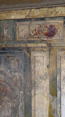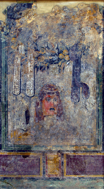 As was earlier mentioned, the First Style did not only consist of imitation marble surfaces, but occasionally depicted objects hanging on the faux wall. Many of these appear to be emblematic motifs such as fillets or commemorative scarves symbolising betrothal, masks possibly signifying Dionysus or the theatre, and garlands of flowers and fruit symbolising the pagan eucharist and votive commemoration (fig.4). [For an in-depth study of the First Style see Laidlaw, A., 1985, The First Style in Pompeii: Painting and Architecture.]