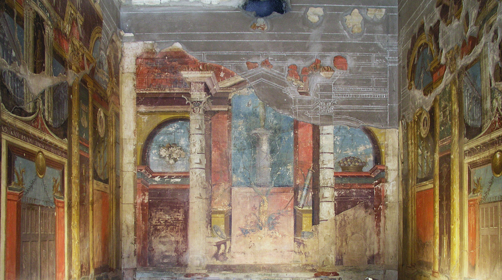 Triclinium – Villa di Poppea, Oplontis, opposing lateral walls mirror each other except for a few emblematic and symbolic details