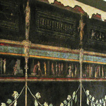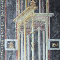 In contrast to Vitruvius's demand for structural realism in painting the Third or ‘Ornate’ Style as Mau named it, moved further and further away from representations of "a thing which really exists" to depictions of architectural fantasies interwoven with arabesque motifs and grotesque figures (fig.1). As the architectonic references became less real they functioned as frames for increasing amounts of figuration and narrative paintings. These mainly consisted of bucolic, sacro-idyllic and mythological landscapes inhabited by a pantheon of male and female gods accompanied by their emblemata and acolytes (fig.2). Somewhat surprisingly, this opulent rococo-like departure is usually dated to the mid-to-late Augustan period, which is normally described as a return to more stoic Roman values. This style also departed from the two previous styles by replacing faux marble representations with large monochromatic areas, normally red, black or white, and in some cases blue and even less rarely green. Slender 'stalk-like' columns and pilasters created geometric divisions in front of and between the monochromatic backgrounds, which often contained figures holding symbolic objects (fig.3). Somewhat bizarrely the irreality of these often winged figures did not provoke Vitruvius's critical eye, but the non-structural architectural references, sometimes combined with grotesque figuration, caused him to write in condemnation,