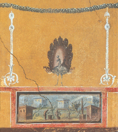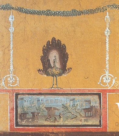 Peacocks above two vignettes depicting tombs and sacrificial worship. Detail from the upper section of a wall-painting depicting Hercules in the garden of Hesperides retrieving Hera's life-giving 'golden apples' (pomegranates). The theme of immortality is also restated by the presence of the peacocks and the scenes of sacrifice and worship amongst the altars and tombs shown in the two vignettes.