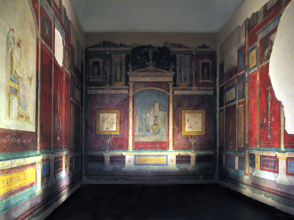 Villa della Fernesina, Rome, cubiculum B, the facing wall depicts an aedicula (shrine) in which the infant Dionysus is nursed by Leucothea and the nymphs of Nisa