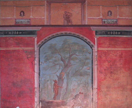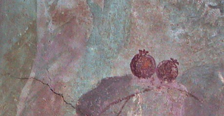 Whilst Mau's and subsequent studies are valuable from a purely formal perspective, they actually tell us virtually nothing about the semiotics and semantics of Roman wall-painting. In fact quite the contrary, the search for ever more subtle stylistic ‘difference’ caused the ‘Four’ styles to become increasingly polarised. As a result, iconographic and teleological similarities that transcend the four style division are invariably ignored. Such as, for example, the frequent use of aediculae (shrines) or votive imagery that is often in the form of commemorative offerings. All of which consistently appear in styles two, three and four and are seldom credited with having symbolic value (fig.1). This lack of iconological analysis was partially due to overly formal analytical methodologies and partially due to the ‘decorative’ classification that was attributed to the paintings soon after their discovery. Hence, the aedicula form, which is often literally and metaphorically central to the wall-paintings, no longer signified its original meaning. Instead, it was relegated to a purely decorative function along with numerous other religious and ritualistic motifs such as gods, heroes, victories, satyrs, Nikes, maenads, tholoi (circular shrines), and imagines clipeatae (commemorative shields). There largely decorative classification also appears to have stopped informed readings of the imagery within compositions. For example, the 'magic' fruit that Hercules was sent to retrieve from the garden of Hesperides is invariably described as 'golden apples' and yet the fruit depicted in fig. 2 (and many other wall-paintings) is quite clearly a pomegranate. Given this fruits pre-Christian symbolism relating to betrothal, the underworld and immortality, it makes it far more likely that the life-giving 'golden apples' in Hera's garden were in fact pomegranates (Fig.2).