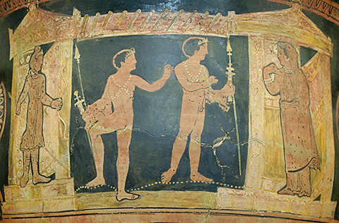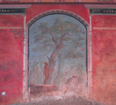 Little's type III agenda is better exemplified by a painting that was discovered after the publication of Scaenographia. It is perhaps the clearest example of "...the far side of the empty court is visible." The divinity honoured within this space is Apollo, symbolised by the oracular tripod with Apollonian torch and bucrania at its base. The clipeate imagines (ancestor shields) situated high up on either side of the propylaeum or entrance facade and the demonic mask and peacock all confirm the sense that we are looking into a sanctuary into which few may enter.