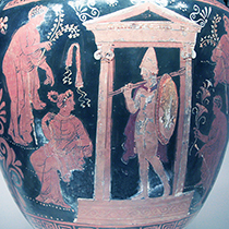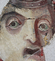 The depiction of a sanctuary within a room is echoed fourfold in the 'room of the masks' in the Casa di Augusto on the Palatine hill in Rome. All four walls depict architectural facades akin to those associated with Roman temporary theatres (fig.2). Set into each facade of 'the room of the masks' is a naiskos or aedicula leading to sanctuary in which can be seen objects associated with commemoration or worship. Both of these framing devices are architectural features designed to highlight the sanctity of the object that is seen or placed within them. They appear on numerous Greek vases and are a common feature in Romano-Campanian wall-painting (fig.3&4). The demonic masks on either side of the central openings in the 'room of the masks' may well perform an apotropaic function as opposed to that which is associated with theatrical personae.