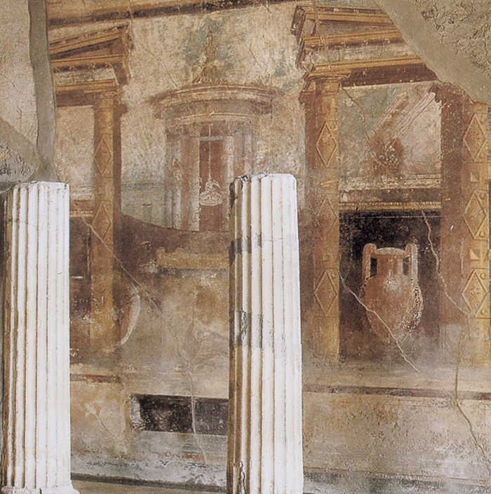 Case del Labirinto - oecus Corinthius. Wall-painting depicting an alter table on a wall that is barring entrance to a tholos sanctuary. To the right is an amphora above which has been placed an apotropaic mask. The alter table and amphora both denote the act of making votive offerings to the divinity or ancestor cult associated with the sanctuary that is visible beyond the closed wall.