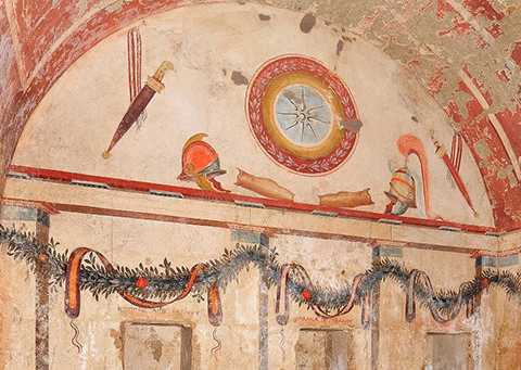 Les historiens spécialistes du théâtre antique attribuent cette évolution anticipée des techniques de perspective aux décors de théâtre et citent en tant que preuves les écrits antiques, tels que le texte où Vitruve déclare qu’Agatharque était le premier peintre à créer l’illusion de profondeur dans les décors peints (Vitruve, VII, 0.11). En revanche, Phyllis W. Lehmann et Stella G. Miller ont souligné, de manière probante, que les représentations en perspective retrouvées dans les tombes macédoniennes, telles que la tombe de Lyson et Kallikles à Lefkadia, auraient pu jouer un rôle de précurseur dans l’utilisation de la perspective au sein des peintures murales du deuxième style (fig.2). Pour de plus amples informations sur cette question, voir : À la recontre des peintures murels.