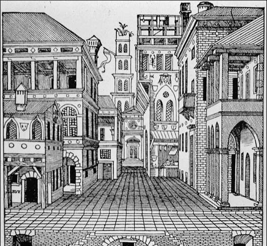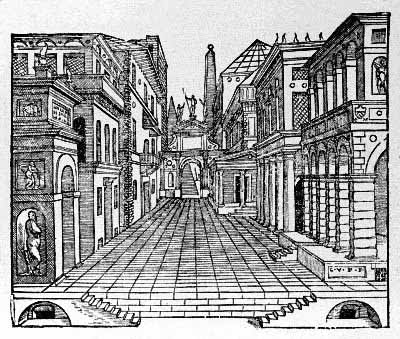Illustrations de Sebastiano Serlio des décors de théâtre tragique, comique et satyrique(1545) basées sur les descriptions de Marcus Pollio Vitruviuis (20s BC.)