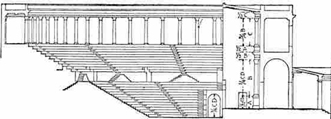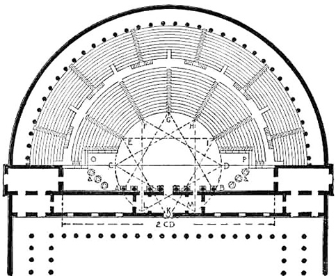 Morgan a traduit l’extrait comme suit: « For instance, at Tralles, Apaturius of Alabanda designed with skilful hand the scaena of the little theatre which is there called the ἑκκλησιαστἡριον, representing columns in it and statues, Centaurs supporting the architraves, rotundas with round roofs on them, pediments with overhanging returns, and cornices ornamented with lions’ heads, which are meant for nothing but the rainwater from the roofs,—and then on top of it all he made an episcaenium in which were painted rotundas, porticoes, half-pediments, and all the different kinds of decoration employed in a roof. The effect of high relief in this scaena was very attractive to all who beheld it, and they were ready to give their approval to the work, when Licymnius the mathematician came forward and said that […] ». Morgan). (ἑκκλησιαστἡριον: Ekklesiasterion or meeting place).