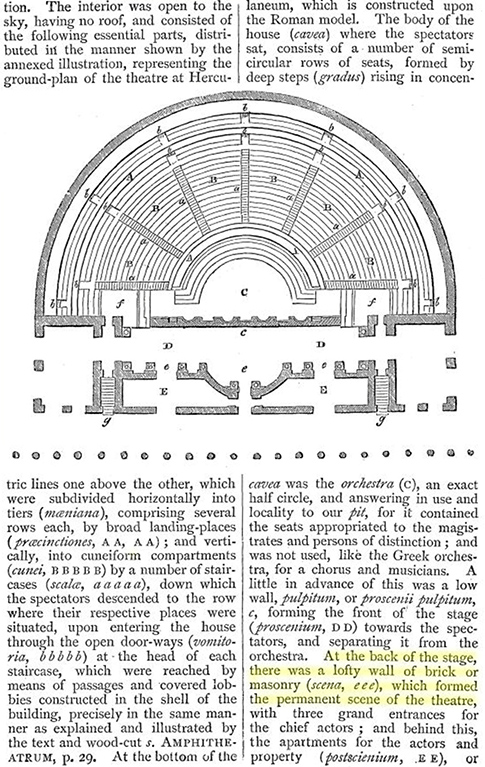 La réapparition de cette expression latine dans le dictionnaire de Smith en 1890, presque deux mille ans après son unique apparition dans De l’Architecture de Vitruve peut bien avoir influencé son association ulérieure avec la façade à colonnes à l’arrière de la scène. Pourtant, dans ce contexte, je ne pense pas que sa réapparition servait à démontrer que Vitruve utilisait cette appellation pour qualifier l’arrière de la scène ou le front de scène, selon votre emplacement par rapport à la scène en question. Je pense que cette expression a été introduite dans la traduction anglaise pour clarifier la référence au « mur située à l’arrière de la scène », que Vitruve décrit dans ces textes comme le front de scène (scaenae frons). La traduction récente de Morgan n’a pas nécessité une telle clarification, car elle se rapprochait beaucoup plus du texte source en latin : « Taking that one of these triangles whose side is nearest to the scaena, let the front of the scaena be determined by the line where that side cuts off a segment of the circle (A-B), and draw, through the centre, a parallel line (C-D) set off from that position, to separate the platform of the stage from the space of the orchestra ». Morgan, dans sa traduction, se permet également de différencier, sur le modèle de Vitruve, la « scaena » ou la façade à colonnes à l’arrière de la scène, de la scène en soi dite « proscaenii pupitum ». Gwilt avait entrepris la même démarche dans sa traduction antérieure : « Of these triangles, the side of that which is nearest the scene will determine the face thereof in that part where it cuts the circumference of the circle. Then through the centre a line is drawn parallel to it, which will separate the pulpitum of the proscenium from the orchestra. ». Bien que cette traduction soit moins claire que celle de Morgan, la même distinction est réalisée entre « pulpitum du proscenium » signifiant la scène surélevée et la « façade de celle-ci », la façade en face de laquelle jouent les acteurs. Gwilt emploie le terme italien scena pour désigner la scène alors que Morgan utilise le terme latin scaena.