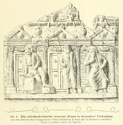 On peut comprendre pourquoi des premiers historiens du théâtre comme Dörpfeld et Reisch se sont intéressés à cette association en latin de scaenae et de frons. Le mot grec προσκήνιο (proskenion) à l’origine de notre mot “proscenium” est l’assemblage de προ (en face de, devant) et de σκηνή (la tente), et signifie par conséquent “en face de la tente ou devant la tente”. Celle-ci, dans le cas qui nous préoccupe était l’endroit où les acteurs itinérants préparaient leurs costumes et le proscenium devait être la toile sur laquelle était peint le décor. Cette toile peinte était suspendue devant la tente, là où se produisaient les acteurs. Lorsque le théâtre grec, de temporaire a évolué vers une structure permanente en pierre, le proscenium, lui aussi est devenu une structure en pierre. Quand les Romains ont transformé cette structure en un façade très èlaborée avec plusieurs niveaux de colonnes, des entrées, des niches, des sculptures, un nouvelle manière de designer le “proskenion” s’imposait pour le distinguer de l’appellation grecque. Proscaenium, sa forme latinisée aurait représenté un choix tout à fait rationnel mais Dörpfeld et Reisch, probablement influencés par A Dictionary of Greek and Roman Antiquities et soucieux de chercher le soutien académique de De Architectura, ont choisi scaenae frons même si, comme je l’ai souligné plus haut, Vitruvius n’a jamais utilisé l’expression pour désigner cette structure.