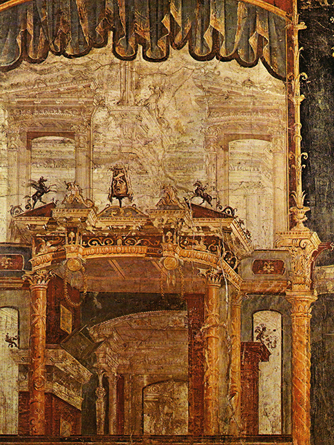 Alors que je suis enclin à concéder que certaines formes de chevauchement se sont produites entre le décor de théâtre et la peinture murale domestique, mon texte ci-dessus a démontré que ce lien ne peut être fait sur la base de l’utilisation vitruvienne des mots scaenae frons au scaenarum frontes. Cette correspondance ne peut non plus être établie à partir d’une preuve visuelle, simple impression d’une ressemblance avec un décor de théâtre et pour laquelle, il n’existe aucun autre témoignage evident. Un panneau de Palaestra à Herculaneum est un exemple classique du type de déformation possible quand une preuve est seulement basée sur des similarités visuelles (fig.1). Le panneau semble représenter l’arche de l’avant-scène du théâtre y compris les rideaux drapés. Même la couleur rouge de l’arche du proscenium évoque le théâtre italien omniprésent du dix-neuviéme siécle. Cette ressemblance étrange conduit à se poser la question suivante: comment est-il possible que ce fragment de peinture, realisé deux mille ans plus tôt puisse représenter un type de théâtre construit au milieu du dix-neuvième siècle?