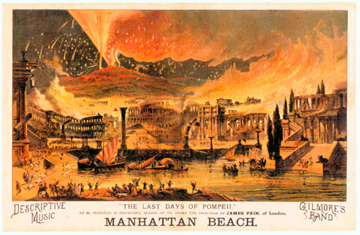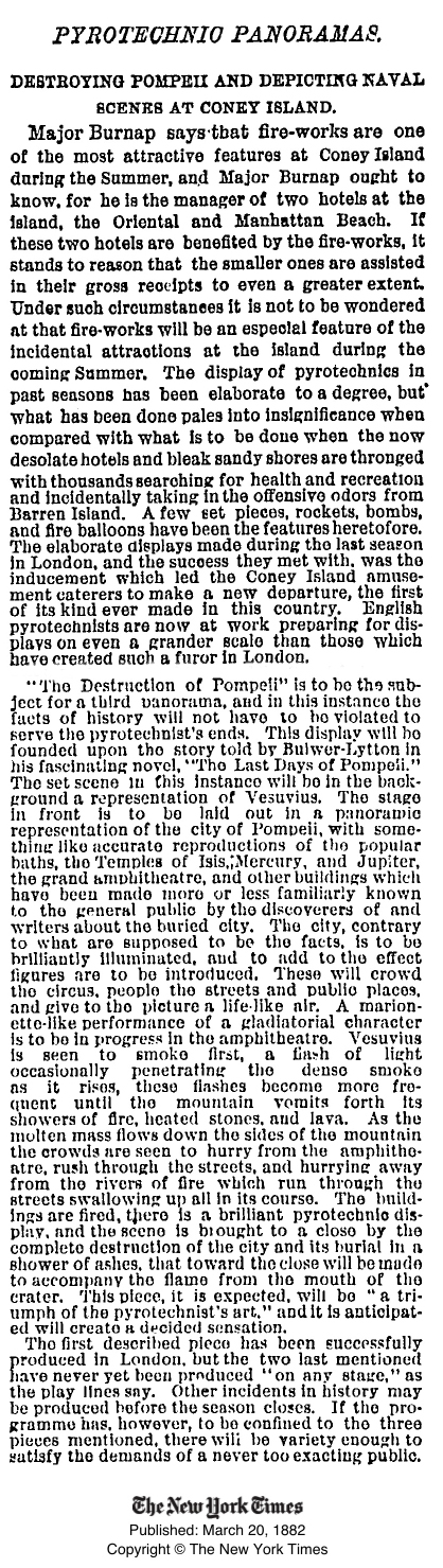(gauche)The Last Days of Pompeii Piccola, Pompéi, feu d’artifice, 1885, et (droite) description d’un spectacle pyrotechnique antérieur sur le thème de Pompéi à Manhattan Beach, publiée dans le New York Times du 20 mars 1882