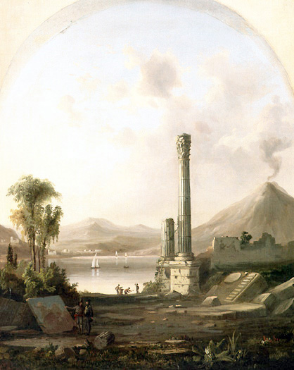 Pompeii, 1855, Robert Scott Duncanson – romanticised view of Pompeii, depicting two men viewing a fragment of Pompeian wall-painting in the bottom-left foreground with Vesuvius smoldering in the background. Smithsonian American Art Museum, Gift of Dr. Richard Frates