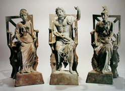 The Capitoline Triad, Jupiter, Juno, and Minerva were gods associated with the Roman State and worshiped in civic temples called Capitolia (fig.1). After paying due allegiance, citizens were then free to worship any number of indigenous or imported gods in public and private sanctuaries, temples, shrines and in-house sacraria (figs.2-4). In-house worship was also directed towards placating and seeking the support of ancestor spirits and the tutelary deities that were thought to protect the house. The many thousands of amulets and portable deity sculptures found throughout the Roman world, suggests that worshiping the gods was not always confined to locations such as temples and sanctuaries, but that carrying and wearing fetish objects was very much the norm. Lyttelton and Forman succinctly summarise Roman attitudes to fetish beliefs in The Romans – Their Gods and Their Beliefs. “The everyday world of the Romans was populated by a multitude of divine spirits, envisaged more or less as intermediate between men and the powerful gods of heaven and the underworld. It is easy to underestimate the importance of the supernatural world in the thoughts and apprehensions of the Romans; their lives were overshadowed by the apparently inexplicable elements in the world around them. These they tried constantly to control by prayers, sacrifices and magic.” (Lyttelton & Forman 1984:31)
