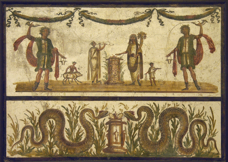 Lower section: two serpents ( agathodaimon ) eating from the family altar