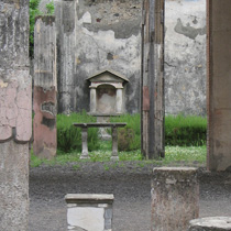 Les lararia situés dans les atria ressemblaient la plupart du temps à des temples miniatures, dotés de sculptures ou de références picturales dédiés à des divinités gardiennes (fig. 1). Les divinités constituaient le noyau des croyances religieuses pour le dominus ou la domina (le maître et la maîtresse de maison) et pour la maisonnée en général. Installer le lararium principal dans l’atrium aux côtés de l’imagerie liée au culte des ancêtres permettait, d’une part, de sanctifier la partie de la maison la plus ouverte au public et d’autre part, de signifier à tous les arrivants que celle-ci jouissait de la protection d’esprits puissants et d’ancêtres bienveillants. Dans certains cas, les lararia, ou leurs équivalents dans les jardins, étaient alignés sur l’entrée de la maison ; ils signalaient ainsi son statut sacré et protégé à quiconque passait devant eux (fig. 2). La porte principale de la maison restait ouverte pendant les heures du jour, hormis en temps de crise. Aligner le lararium sur l’entrée de la maison exprimait une relation étroite entre l’imagerie apotropaïque placée à l’entrée et la symbolique du passage vers le monde métaphysique, car le lararium incarnait la maison miniature habitée par des esprits gardiens au sein de la maison.