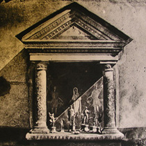 La mise en abîme suscitée par la juxtaposition de la maison et de la maison spirituelle miniature évoquait à son tour l’image d’un sanctuaire à l’intérieur d’un sanctuaire. Ainsi, à travers les offrandes quotidiennes, généralement au moment du repas, les occupants sanctifiaient la maison et leur propre personne par la même occasion (pour plus d’informations à ce sujet, voir Bettina Bergman, The Roman House as Memory Theater: The House of the Tragic Poet in Pompeii, The Art Bulletin, Vol. 76, No. 2, 1994, p. 225‑256). La présence de lararia sous forme de niches ou de peintures dans l’espace de travail indique que les serviteurs étaient également encouragés à invoquer les esprits gardiens, assurant par ce biais le bien-être de toute la maison (fig. 3). Les vestiges carbonisés de sanctuaires portables en bois, découverts dans les étages supérieurs de certaines maisons à Herculanum, indiquent que les lararia ne se trouvaient pas toujours dans un lieu fixe (fig. 4).