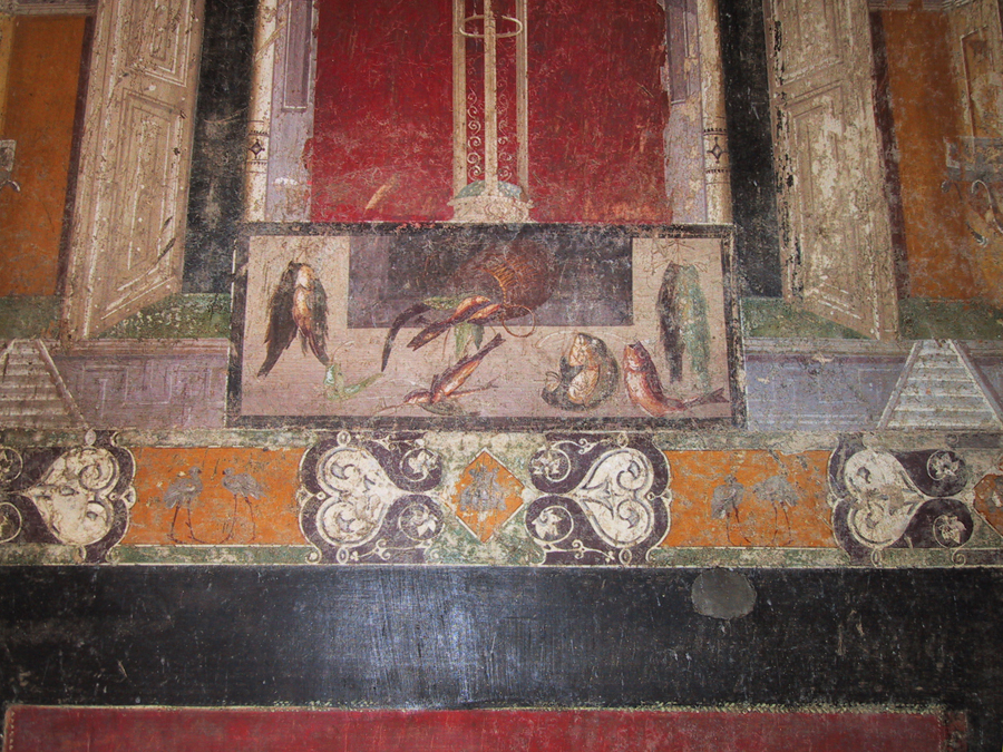 Offrandes de poissons sur une vignette placée devant un trépied apollonien, Casa di Marcus Lucretius Fronto, Pompéi