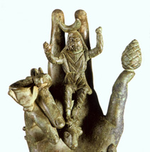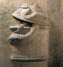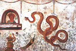 Des offrandes comme celles-ci représentaient la substance régénérative première, en attente d’être fertilisée par le sperme iconique du serpent. Elles apparaissent dans de nombreux contextes favorables, sur les murs de tombes et de sarcophages, sur des sculptures talismaniques et sous forme de fleurons au sommet de tombeaux en tant que symboles de renaissance et d’immortalité. Les serpents, aux côtés d’autres motifs d’animaux, d’oiseaux et de plantes, constituaient une part importante du symbolisme eschatologique antique associé aux sarcophages et aux chambres funéraires (fig. 5). Les images de serpents étaient aussi investies de pouvoirs apotropaïques, et étaient donc utilisées pour empêcher le mal de s’introduire dans la maison. Certaines représentations de serpents étaient accompagnées de textes destinés à détourner le visiteur de comportements bien plus prosaïques, comme d’uriner dans un endroit inapproprié, de déféquer ou de répandre de mauvaises odeurs à l’intérieur de la maison. Tout comme le culte des Lares et des Pénates, celui du serpent trouvait probablement son origine dans d’antiques croyances du monde agricole, où on attendait alors de cette mystérieuse créature, qui émergeait des Enfers pour y retourner ensuite, qu’elle offre une protection et la garantie d’une bonne récolte. En raison de cette origine souterraine, le serpent a signifié par la suite le retour des esprits des ancêtres décédés, devenant ainsi une image funéraire omniprésente ainsi qu’un symbole lié aux sanctuaires domestiques (fig. 6).