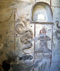 Le besoin de donner à la maison une apparence de sanctuaire était si impératif que l’alliance déjà puissante des Lares, des Pénates et des Génies se voyait pourtant éclipsée par un gardien et symbole de fertilité encore plus prolifique, qui prenait la forme d’un serpent (fig. 1 à 3). Bien qu’il ne représente aucune espèce identifiable, l’agathodaimon, ou serpent porte-bonheur, ressemble à un serpent constricteur. Sa capacité presque fantomatique à muer et sa présence furtive aussi bien au-dessus qu’en-dessous du sol en faisaient l’esprit domestique le plus souvent illustré. À Pompéi, les agathodaimon sont souvent représentés par couples, le mâle et la femelle s’approchant d’un autel où des offrandes sont disposées (un œuf, une pomme de pin, une grenade…). Ces offrandes signifient la naissance et la fécondité, et ensemble, elles symbolisent la renaissance (fig. 4).