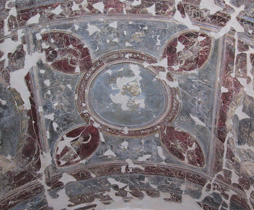 Au sommet du plafond voûté du sanctuaire d’Ilion, on peut observer un médaillon illustrant l’enlèvement de Ganymède, une figure mythologique associée à l’apothéose et à l’immortalité (fig. 2). Des variations sur ce thème étaient souvent placées au sommet des plafonds ; sa présence ici tend à confirmer l’opinion de Pesando, qui estime que le sacrarium était employé pour la pratique cultuelle, probablement liée aux Troyens ou aux ancêtres de la familiae Troianae. Cette idée est attestée par des peintres murales et par des panneaux en relief recouverts de stuc, qui illustrent des récits homériques à la gloire d’Hector, alors déifié et considéré comme le héros protecteur de la maison.