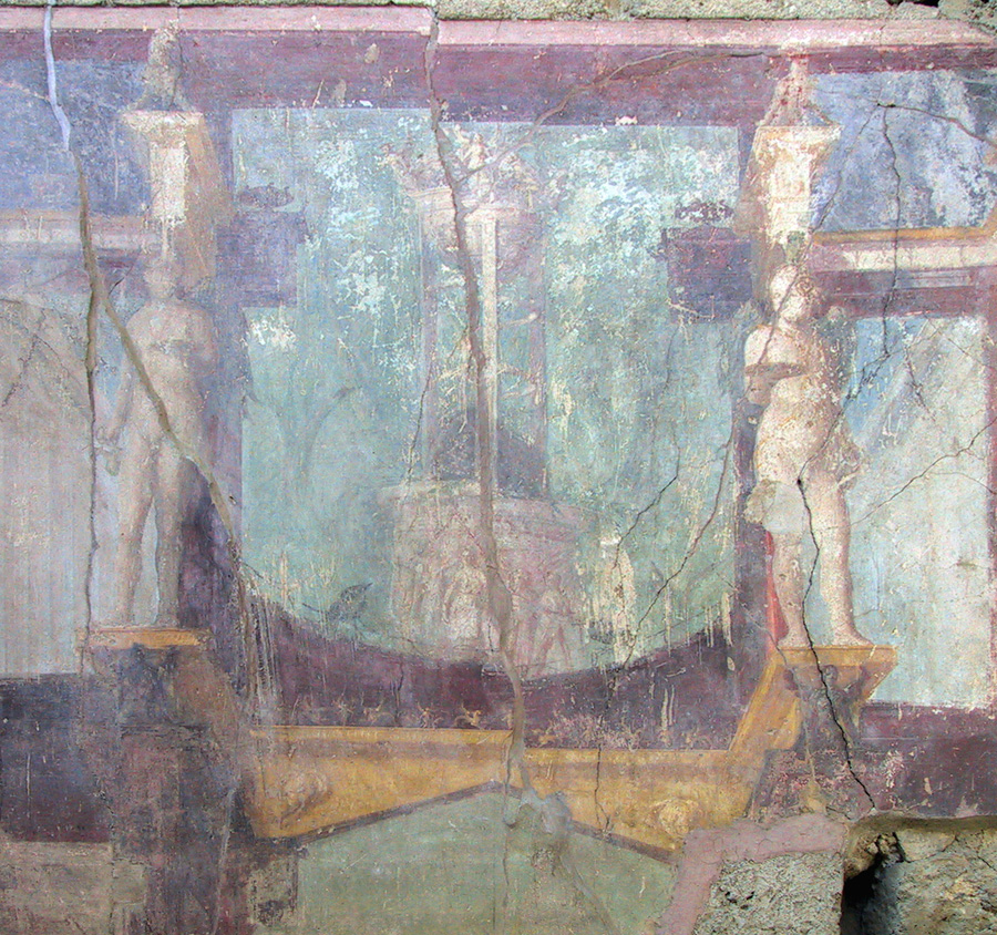 Wall-painting depicting a lowered curtain revealing an Apollonian Tripod with winged Victories emerging from it, Casa del Criptoportico, Pompeii