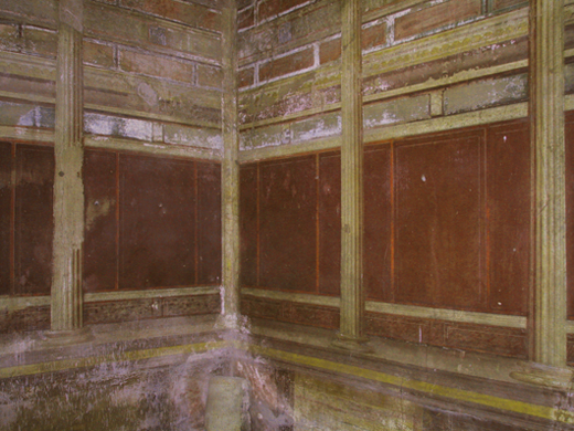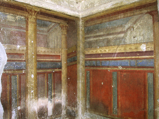 These two rooms exemplify the way in which pictorially closed and open vistas might have affected the spatial psychology of the inhabitants. The wall-painting in the lower example emphasises solidity and closure, typical of First or early Second Style wall-painting, whilst the painting in the room above encourages the viewer to engage with a virtual world beyond the room.