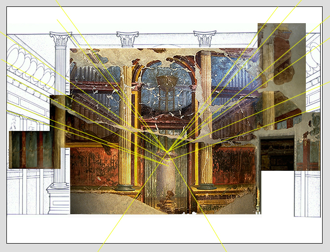 Picard’s proposition would not have had a systematic basis without the transition between planar and spatial composition, that occurred in Roman wall-painting in the early part of the first-century BC. The quintessential new feature that orchestrated this change was linear perspective. It dissolved the hitherto planar characteristic of the wall to such an extent that it created sophisticated virtual realities (fig.1). Although these did not rigidly conform to the laws that governed perspective some fourteen hundred years later, its orientation within the entire room created highly convincing trompe l’oeil compositions. As Picard correctly observed the image that came to dominate this new development was that of the entrance. Its pictorial representation took many forms such as doors, gates, pediment facades, walled-up openings, cave or grotto entrances and aediculae tombs. These images then acquired eschatological or divine significance through close visual proximity to statues of deities, tholoi, stelae, naiskoi, incense burners, food offerings, and votive or sacrificial objects. As Picard pointed out, this mixture of functional and spiritual imagery invariably represented either a stylised tomb entrance or a temenos sanctuary.