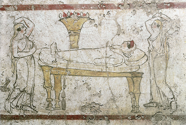 Préparation du défunt, étendu avec un ex-voto sous la forme d’un panier de nourriture rempli d’œufs et de grenades symbolisant la renaissance. Il est accompagné de deux femmes effectuant un thrène, Museo Archeologico di Paestum