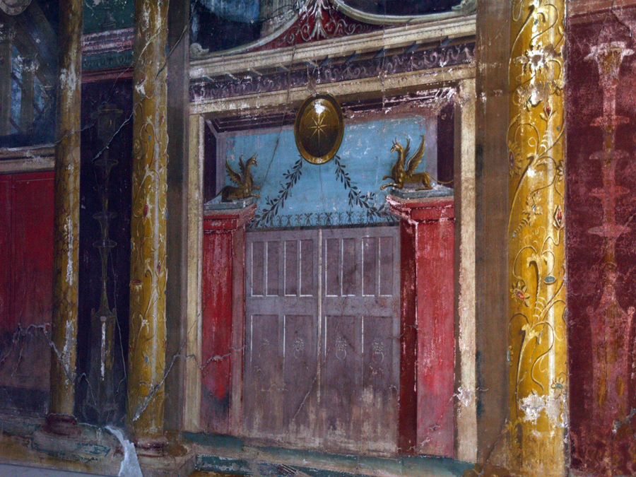 Villa di Poppea, Oplontis, triclinium, mur est représentant l’entrée d’un sanctuaire tholos, flanquée de colonnes incrustées de gemmes précieuses, ornée de griffons ailés de part et d’autre de l’entrée fermée par un portail. Le linteau de l’entrée est pourvu d’une frise illustrant des créatures marines liées aux typhons, et d’un bouclier macédonien à huit pointes orné de rameaux d’olivier