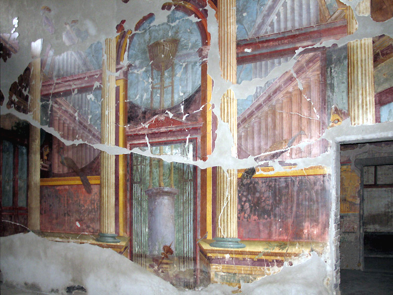 Villa di Poppea, Oplontis, salle 15, peinture murale représentant l’entrée d’un sanctuaire dédié à Apollon et aux ancêtres familiaux