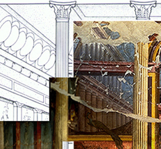 Derrière le portail, des colonnades à deux niveaux délimitent le sanctuaire. Quant à la divinité présente dans ce lieu sacré, nous ne pouvons que conjecturer qu’il s’agissait d’Apollon car le trépied au sommet du piédestal ainsi que la torche et la bucrania (crâne de taureau) situées à sa base sont emblématiques de sa présence (fig. 4). Les imagines clipeatae, à savoir les boucliers commémorant les ancêtres qui sont accrochés dans les sections supérieures des colonnades, peuvent également suggérer que le sanctuaire virtuel servait de lieu dédié à l’adoration des ancêtres (fig. 5).