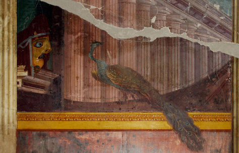 Dans la pièce 15 adjacente, les entrées fermées sont remplacées par un portail à moitié ouvert menant à un sanctuaire (fig. 1). Il s'agit de l’un des rares exemples de peinture murale romaine où l’entrée est représentée ouverte, nous permettant de nous plonger dans un espace virtuel au-delà du mur. Les figures architectoniques et naturelles dans ces peintures correspondent toutes aux proportions humaines, ce faisant, elles créent une douce transition entre l’espace physique de la pièce et l’espace virtuel de la peinture. Cette caractéristique renforce à son tour le lien charnel entre l’observateur et la peinture-même. La demeure métaphysique située au-delà de la porte crée une fascinante mise en abyme entre le concept de la maison en tant que sanctuaire et son double virtuel puisqu’ils fusionnent parfaitement. Bien que la porte soit ouverte, la vue est largement obstruée par un piédestal où se dresse un trépied (fig. 2). La présence de symboles de l’immortalité renforce le thème du sanctuaire. Ces symboles prennent la forme de paons perchés sur les rebords de part et d’autre de l’entrée, chaque mur étant accompagné d’un masque démoniaque à l’origine de cette présence apotropaïque omniprésente supposée nécessaire pour chasser les intrus malveillants (fig. 3). De nombreuses représentations de paons ont été retrouvées sur les murs intérieurs des tombes et des sarcophages. Les Romains pensaient que le motif en forme d’œil dessiné sur leur queue leur permettait, par association, aux défunts de voir à travers l’éternité et d’atteindre ainsi l’immortalité, car les deux notions étaient indissociables l’un de l’autre.