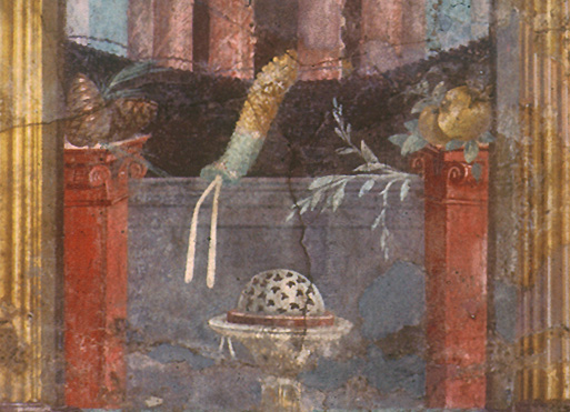 Gauche : une pomme de pin, symbole de renaissance souvent représenté dans un contexte funéraire en fleuron de tombe ou bien en peinture dans un tombeau ou un sarcophage