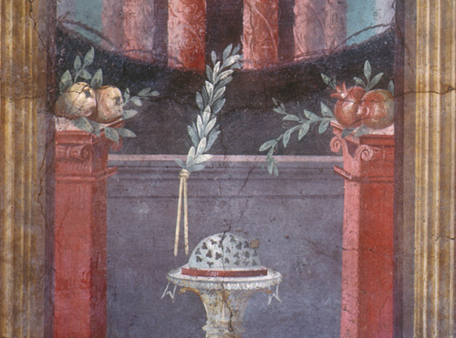 Droite : une grenade évoquait la présence de la divinité partiellement associée aux enfers, Perséphone ; en outre, elle symbolisait les fiançailles, la fécondité et la renaissance