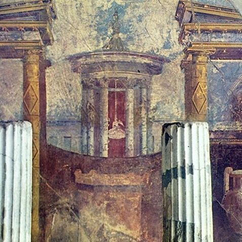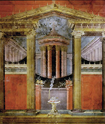 Comme Gilbert-Charles Picard l’a signalé, les peintures murales romaines représentant des fausses-portes étaient un concept générique et ne requérait donc pas la présence obligatoire d’une porte. Ainsi, le motif d’une barrière derrière laquelle se dressait un sanctuaire ou un objet commémoratif, tel qu’une tholos ou un piédestal surmonté d’une statue ou d’une urne suffisait à suggérer la présence d’une porte. Une composition typique de tholos apparaît dans les peintures murales dans l’oecus corinthius de la casa del Labirinto, discutée précédemment lorsque nous avons abordé le thème des jardins paradisiaques et de la Maison en tant que sanctuaire (fig. 1). Les compositions reflétées sur les murs latéraux de cette pièce sont un exemple frappant de la juxtaposition classique de motifs de barrières associés au concept de fausse-porte sans pour autant représenter de porte. Ces peintures représentent des entrées murées ou fermées derrière lesquelles se dressent des tholoi funéraires ou commémoratives. Picard associait cette image avec « le tombeau de l’ancêtre héroïsé protecteur de la famille » (Picard, 1968, p. 97). Cette association est renforcée par les imagines clipeatae (médaillons représentant le visage du défunt sur des boucliers) pendues entre les colonnes de la tholos, davantage soulignée ensuite par des motifs, tels que le lierre poussant sur les colonnes, révélateur de la présence de Dionysos ou la couronne de Zeus au centre de la tholos. L’aigle aux ailes ouvertes de Zeus perché sur la couronne, symbole probable du vol vers l’éternité, renforce de plus belle l’apothéose des aïeux.