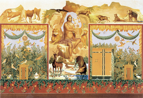 According to Zanker it would appear that nothing was beyond the desire of middle-class Pompeians if they could find a way of ‘imitating’ the object of their desire - not even royal game-parks. This proposition is illustrated by referring to a wall-painting located in the garden of the House of Orpheus (Plate 14.2) (fig.1). The physical and financial unattainability in this instance is not symbolised by the royal villa but by the even more exotic image of the private game park, which only royalty or the fabulously wealthy could afford. His illustration is a lithographic copy of this now degraded wall-painting and the caption informs us that we are looking at a ‘game park’ in which Orpheus can be seen using his lyre to enchant wild animals. Despite the fact that Orpheus is the subject of the painting he gets second billing to the image of the ‘game park’. Why has the author taken Orpheus out of the wilderness and placed him in a royal theme park? Does the image of the cave that he is seated in front of mean nothing in mythological terms or was it just another one of the theme park attractions?